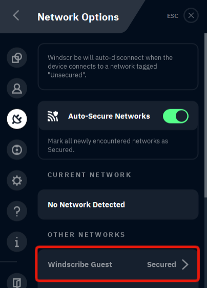 In the screenshot above, the Windscribe Guest network is Secured which means that each time this computer connects to that network, the Windscribe app knows to enabled the VPN. If this was set to Unsecured, then the app would instead keep the VPN disabled while on that network.