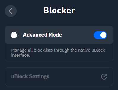 After you've enabled this, all the other Windscribe Blocker options will disappear as they will conflict with your custom uBlock settings. If you want to go back to the regular Windscribe blockers, simply disable the Advanced Mode.